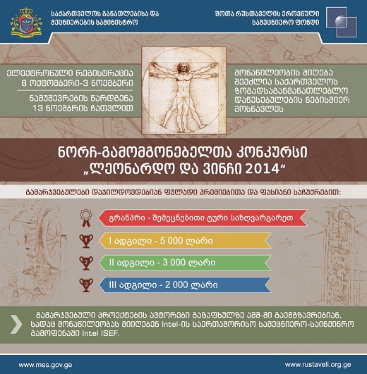განათლებისა და მეცნიერების სამინისტროს შოთა რუსთაველის ეროვნული სამეცნიერო ფონდი ნორჩ-გამომგონებელთა კონკურსს „ლეონარდო და ვინჩი 2014“ აცხადებს. 17.09.2014